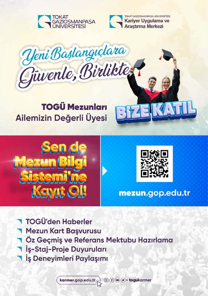 , Tokat Gaziosmanpaşa Üniversitesi mezunu olan mezunlarımızın kayıt olabildikleri bir sistemdir. Mezunlar ile iletişim, sistem üzerinden sağlanmaktadır. Mezunların işe yerleşme, eğitime devam, gelir düzeyi, mezun memnuniyeti gibi istihdam bilgileri, sistematik ve kapsamlı olarak